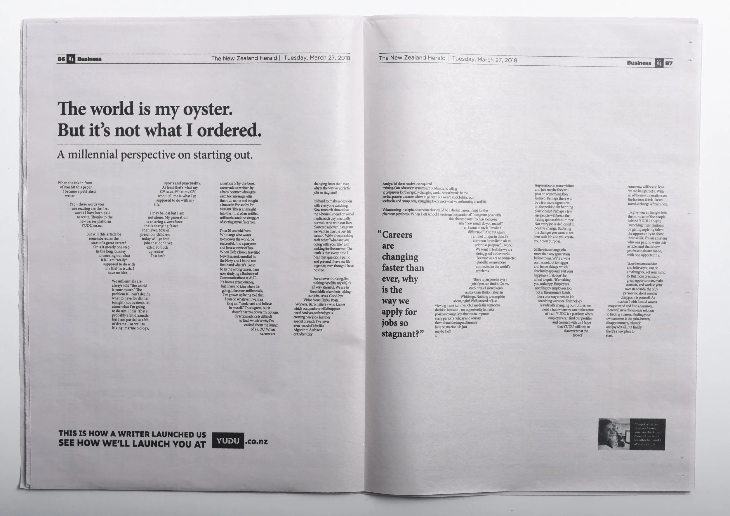 We got the opportunity to name, create and launch a job site with New Zealand's largest media agency. So to help differentiate us from the other more traditional jobsites in NZ we launched us by launching you. Anyone could apply to help launch us, and in return their skills where plastered across New Zealand. Every single emerging talent we used was hired and everyone in New Zealand knew that YUDU was the perfect place to launch your career.